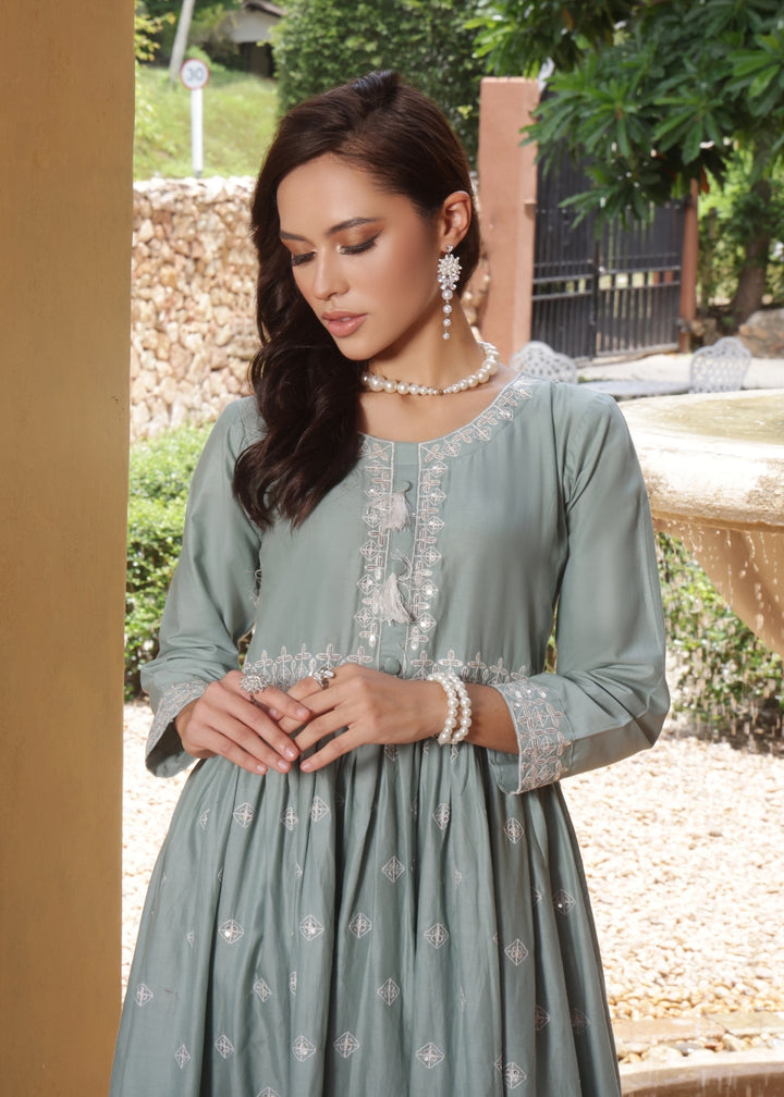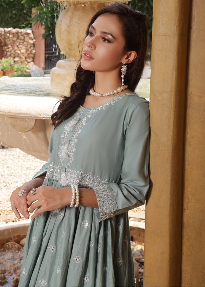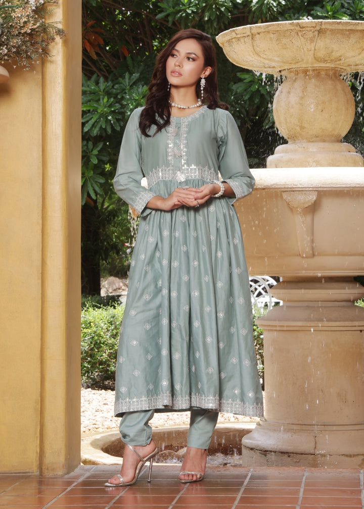 Step into timeless elegance with Gulrukh in a serene off-white shade. This stitched 2-piece lawn cotton outfit features a flaired frock with a fitted upper body, paired gracefully with straight trousers for a modern yet traditional appeal. The delicate embroidery on the neckline with playful tussles, along with the pretty embroidered sleeves, adds a touch of charm and sophistication. Light, breezy, and graceful — perfect for chic summer gatherings.