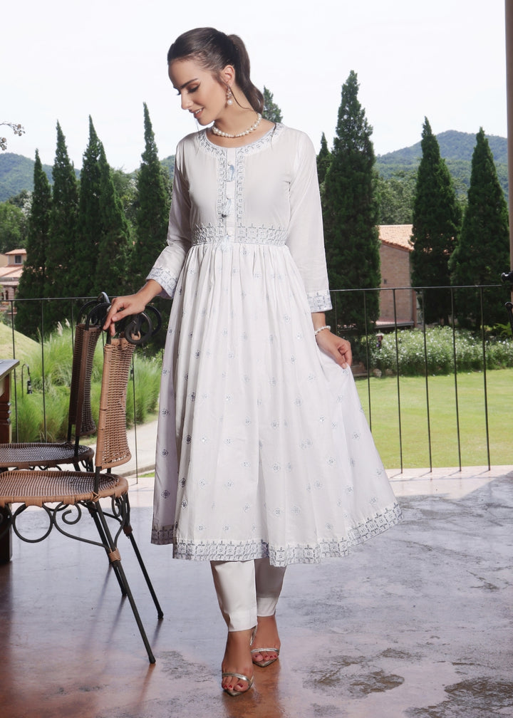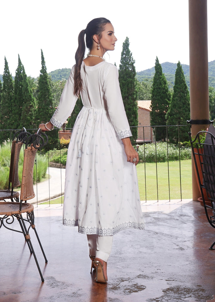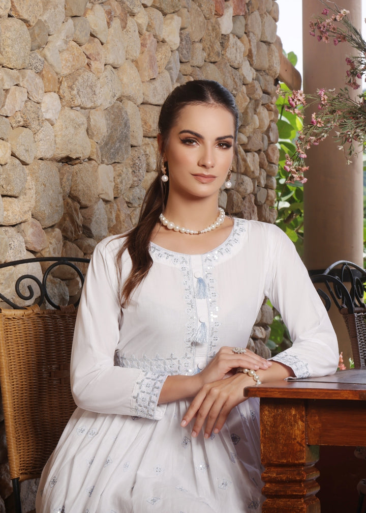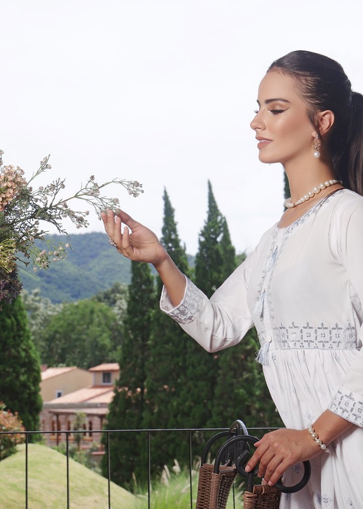 Step into timeless elegance with Gulrukh in a serene off-white shade. This stitched 2-piece lawn cotton outfit features a flaired frock with a fitted upper body, paired gracefully with straight trousers for a modern yet traditional appeal. The delicate embroidery on the neckline with playful tussles, along with the pretty embroidered sleeves, adds a touch of charm and sophistication. Light, breezy, and graceful — perfect for chic summer gatherings.